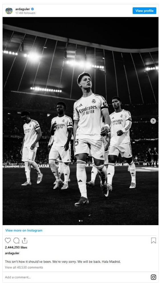“This isn’t how it should’ve been. We’re very sorry. We will be back. Hala Madrid.” he wrote on Instagram, sharing images with his teammates and from the pre-match huddle.