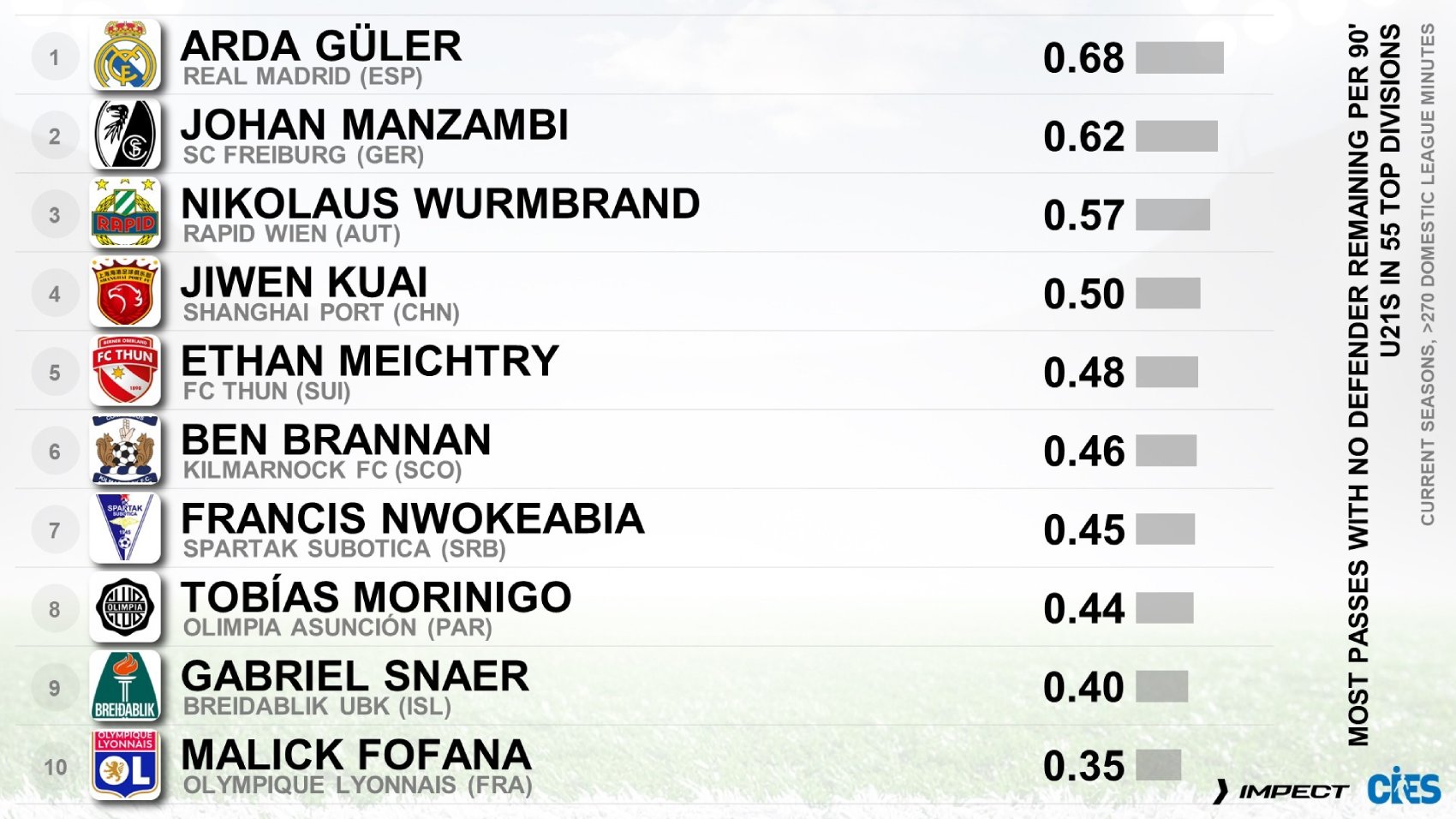 Second, he ranks first in progressive passing efficiency, making the most passes that place a teammate closer to goal than an opponent — averaging 0.68 per 90 minutes. Behind him are Johan Manzambi (Freiburg, 0.62) and Nikolaus Wurmbrand (Rapid Vienna, 0.57).