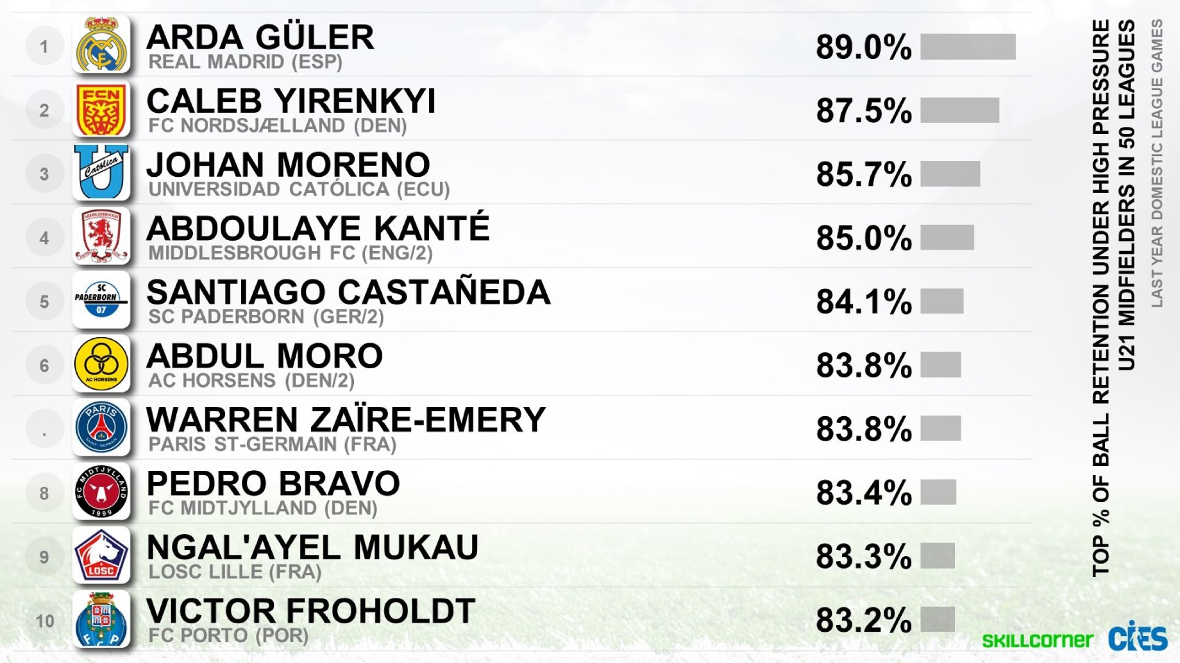 First, Arda boasts the highest ball retention rate under high pressure (89%) among U21 players across 50 leagues analyzed by CIES. The next closest are Caleb Yirenkyi (Nordsjaelland, 87.5%) and Johan Moreno (Universidad Católica, 85.7%). The top 10 also includes rising stars like Warren Zaïre-Emery (PSG, 83.8%) and Victor Froholdt (Porto, 83.2%).