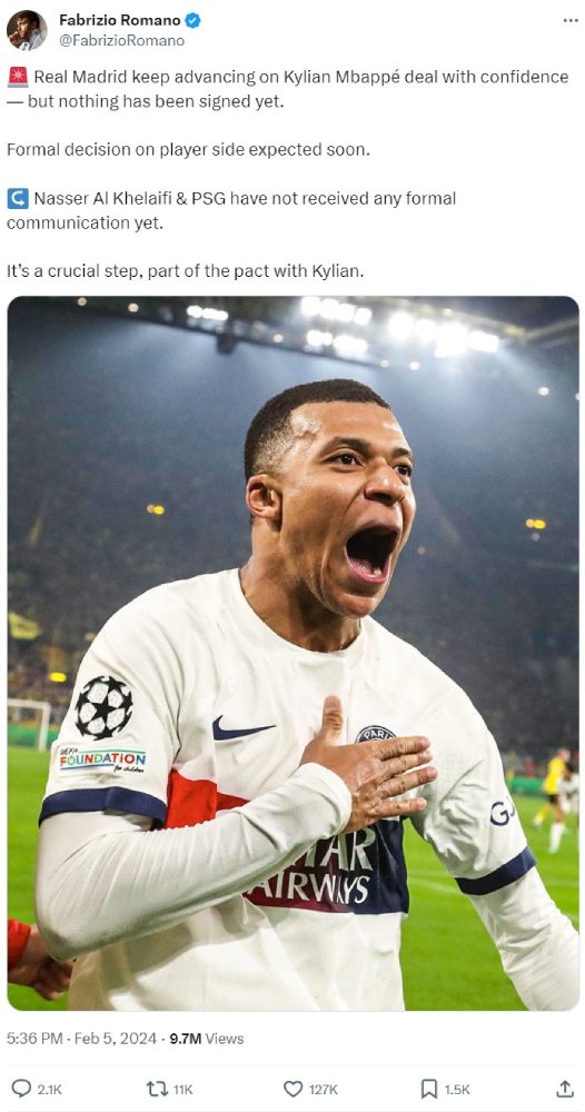 Fabrizio Romano reports that Real Madrid "keep advancing" in their pursuit of Kylian Mbappe. No agreement has been signed at the moment, but the Frenchman is expected to announce his future plans soon; Paris Saint-Germain have not been informed about this yet.