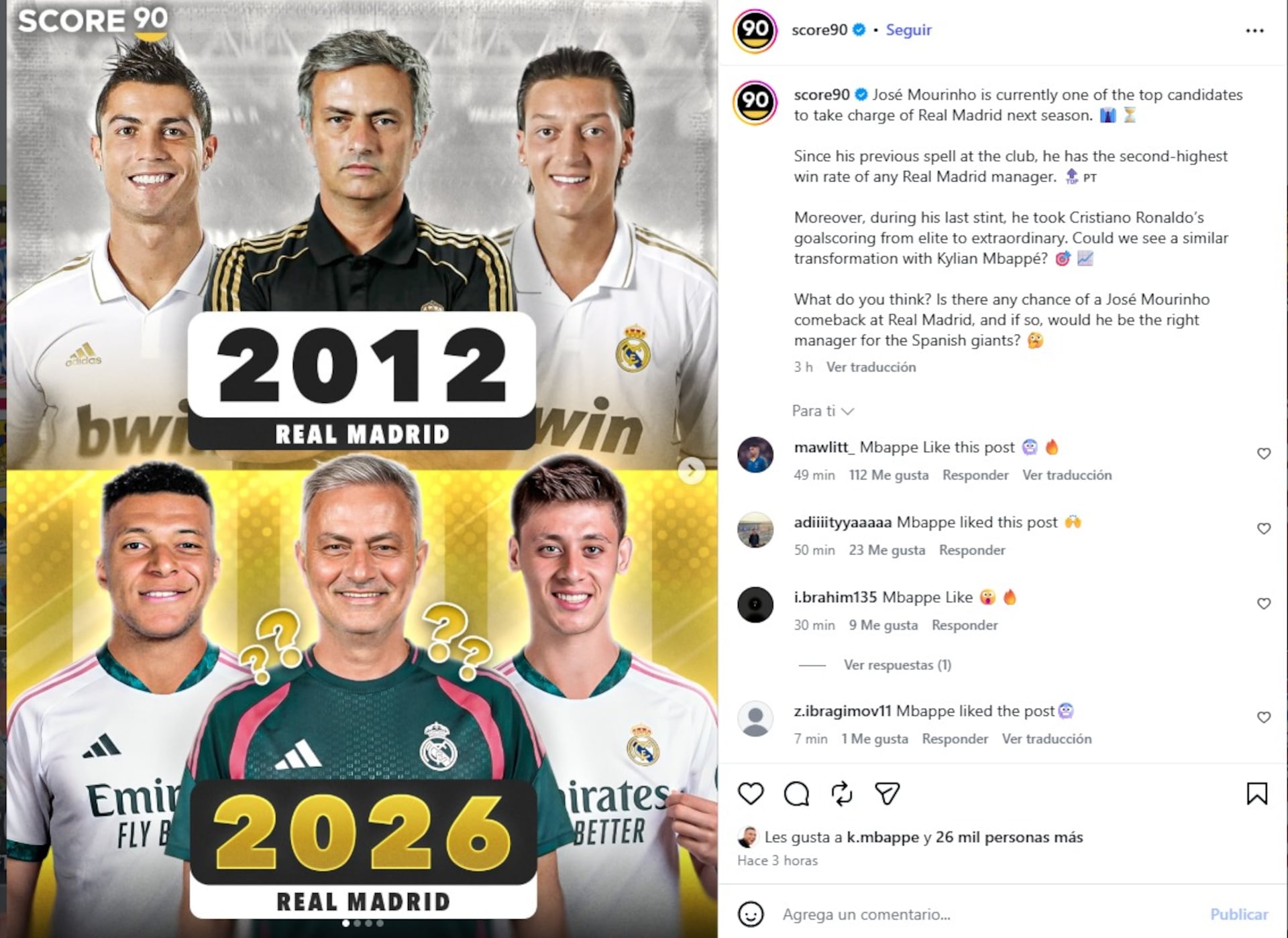 One widely shared post from Score 90 highlighted Cristiano Ronaldo’s scoring numbers under Mourinho, particularly during the 2012 season, and raised the question of whether a similar impact could be seen with Kylian Mbappé. The comparison has sparked debate about how the Portuguese coach could influence the team’s attacking output.