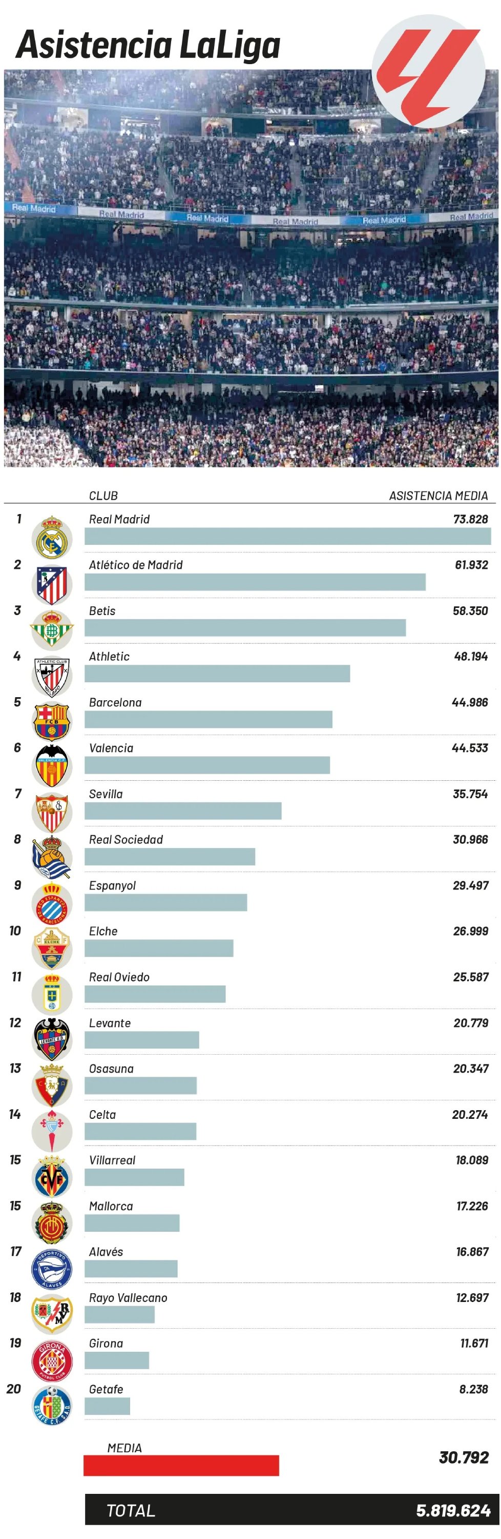 At the top of the rankings, Real Madrid once again lead the way, averaging 73,828 spectators per match at the Santiago Bernabéu, reflecting a 1% increase compared to last season.