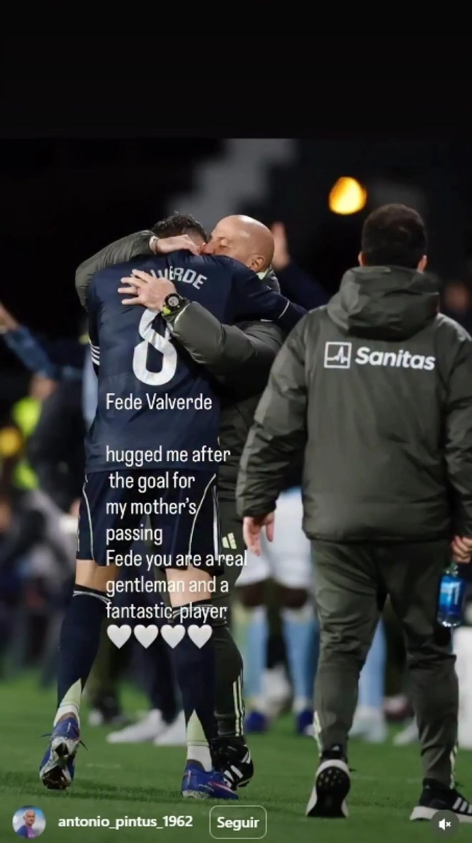 Más tarde, el propio Pintus explicó el motivo de ese emotivo gesto en un mensaje en Instagram: "Fede Valverde vino a abrazarme después del gol por el fallecimiento de mi madre... Fede, eres un hombre noble y un gran jugador".