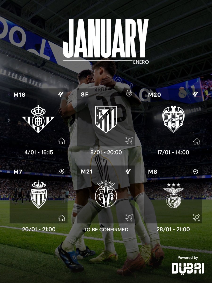 El mes concluirá con dos visitas. El 24 o 25 de enero, el Real Madrid visitará al Villarreal en la jornada 21 de La Liga, antes de viajar a Lisboa el miércoles 28 para enfrentarse al Benfica en el último partido de la fase de grupos de la Champions League.