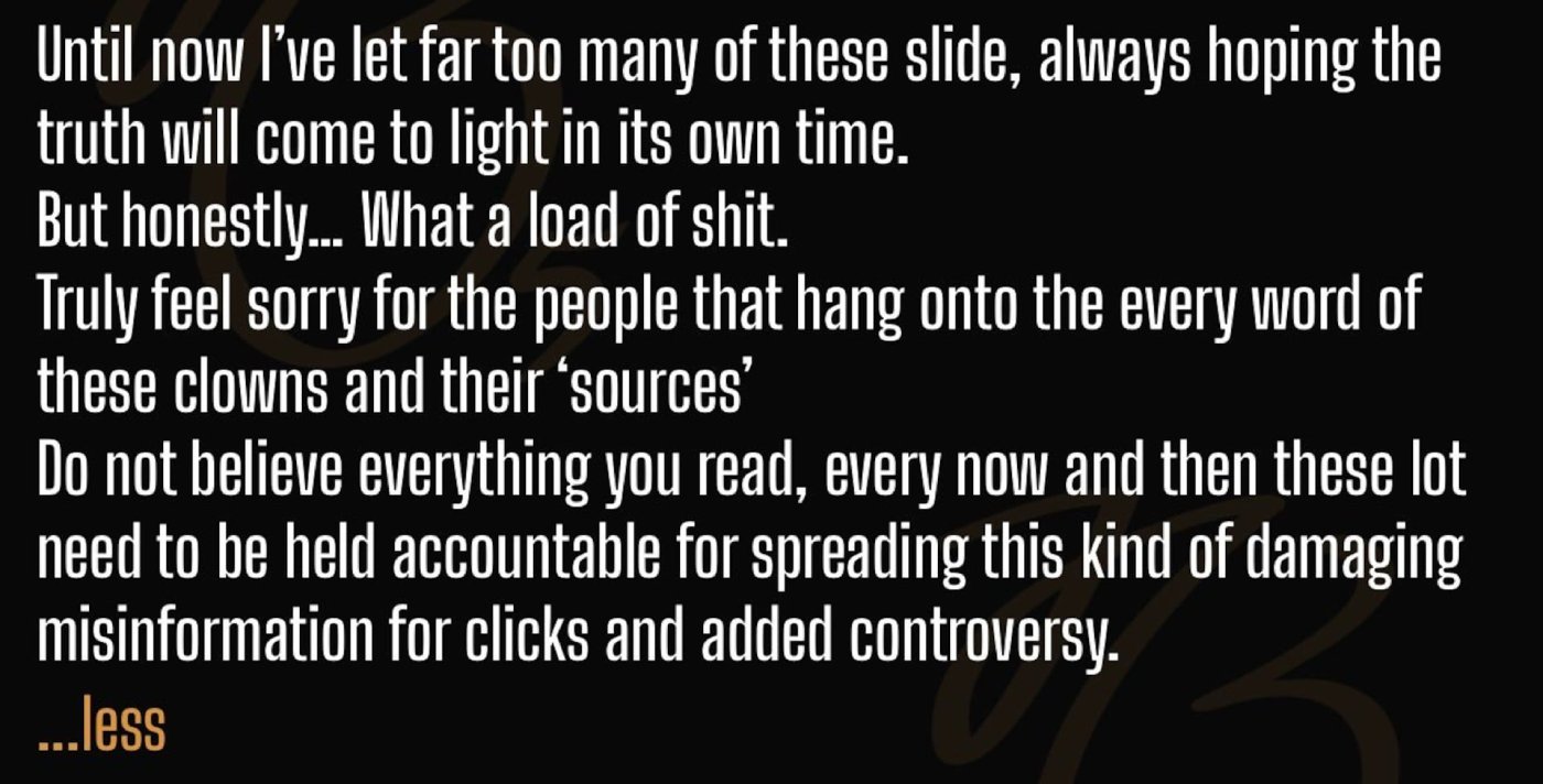 “Until now, I’ve let too many things like this slide, always hoping the truth would come out in time. But honestly… what a load of crap. I genuinely feel sorry for the people who believe every word these clowns and their so-called ‘sources’ say. Don’t believe everything you read. From time to time, these people need to be held accountable for spreading false and harmful information purely to generate clicks and fuel controversy.”