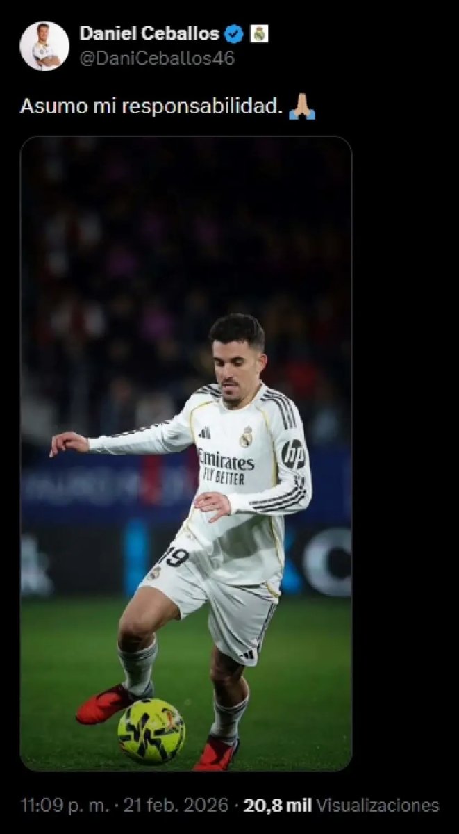 Dani Ceballos shared a message on his social media accounts apologizing for his role in Real Madrid’s late defeat against Osasuna.