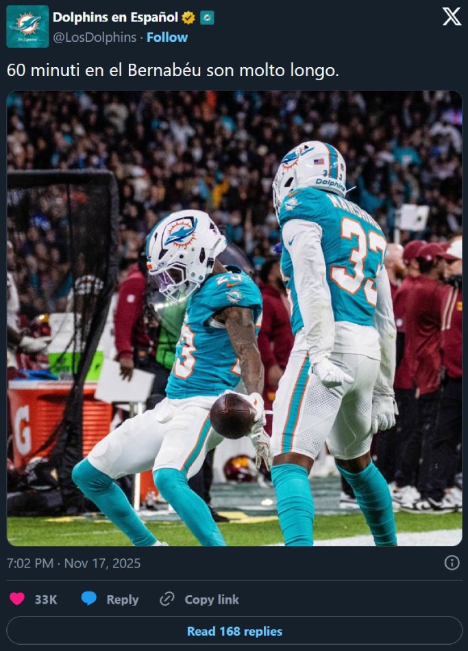 When the Miami Dolphins posted on X, “60 minuti en el Bernabéu son molto longo,” they weren’t just celebrating a dramatic win — they were trolling Real Madrid-style.
