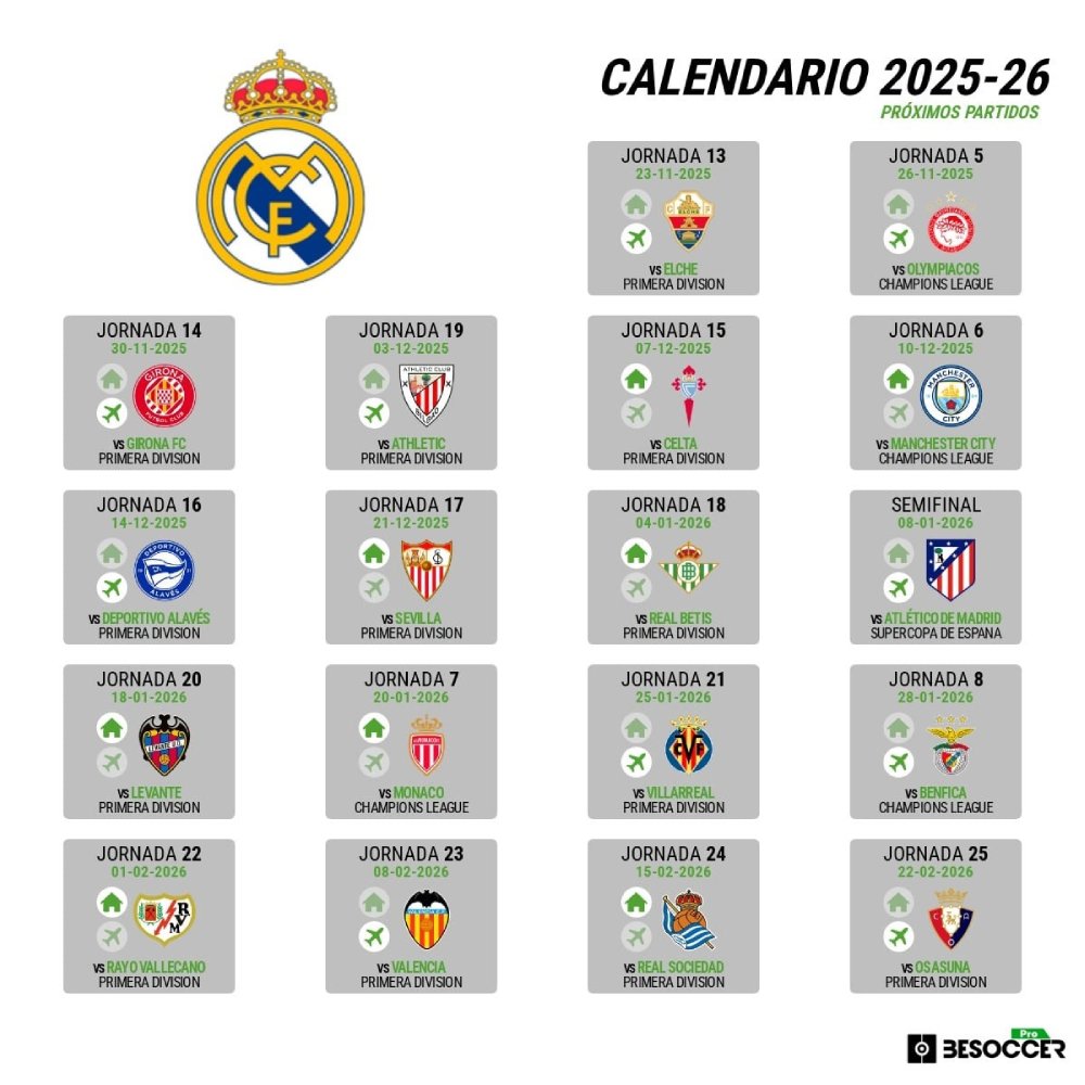 It will be a demanding run. Madrid will play nine matches in 28 or 29 days, essentially one game every three days. Six of those matches are away from home, including difficult trips to Piraeus and San Mamés, plus a Copa del Rey tie on a smaller ground. The team will close this stretch at home against Sevilla around December 20 or 21. Xabi hopes to reach that date with his squad in a strong position to fight for every trophy in 2026.