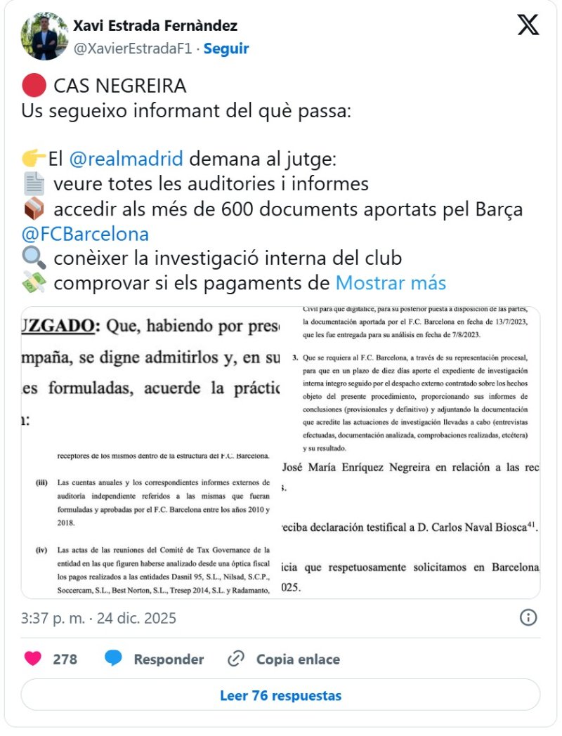 Real Madrid has formally requested full access to the financial documentation included in the Negreira case, seeking to examine all records related to payments made by FC Barcelona over more than a decade. The information was revealed by former referee Xavier Estrada Fernández, who is acting as a private prosecutor in the proceedings, through a post on social media.