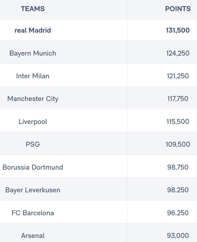 Real Madrid will close out 2025 at the top of the UEFA club coefficient rankings, confirming their continued dominance in European competition. With a total of 131,500 points, the club leads the standings ahead of Bayern Munich, who have 124,250 points, and Inter Milan with 121,250.