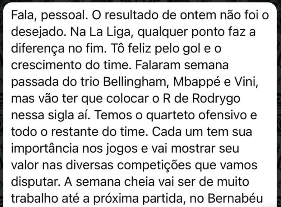 The statement read: "Last week they talked about the trio Bellingham, Mbappé, and Vini, but to this acronym they will have to add the R of Rodrygo. We have the offensive quartet and the rest of the team. Each one has their importance in the games and will demonstrate their value in the different competitions in which we will participate." This message was interpreted by many as Rodrygo asserting his place within the squad and reminding everyone of his value.
