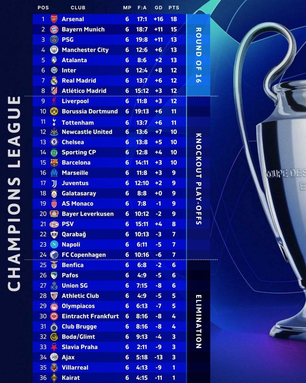 The UEFA Champions League group stage is entering its decisive phase, and after six matchdays, the standings are beginning to reveal which teams hold an advantage heading into the final stretch. Arsenal has been the standout team so far, leading the competition with 18 points, a flawless record of six wins, and an exceptional goal balance of 17 scored and only one conceded. Behind the English side are Bayern Munich with 15 points and PSG with 13, rounding out the provisional top three.
