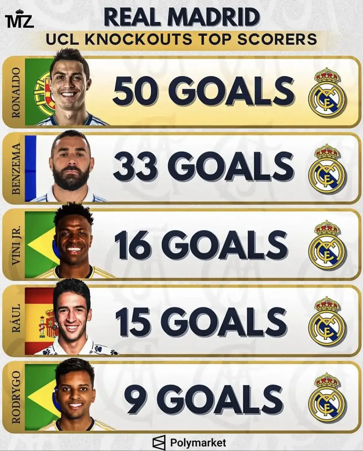 The Brazilian winger now ranks third among Real Madrid players with the most goals in Champions League knockout rounds. Cristiano Ronaldo leads the list with 50 goals, followed by Karim Benzema with 33.