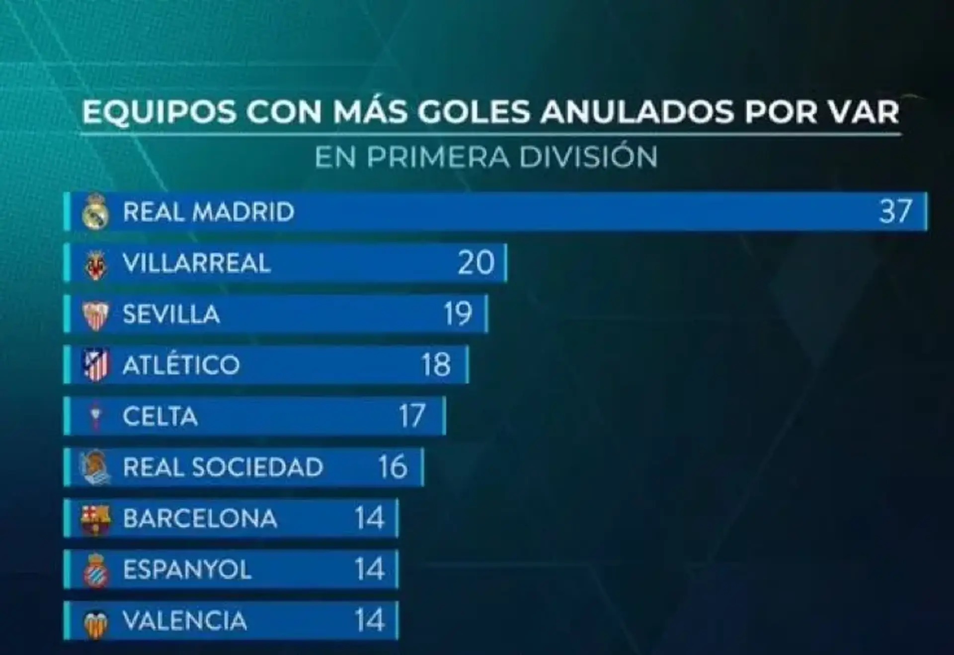 En comparación, el Villarreal ocupa el segundo puesto con 20 goles anulados, seguido del Sevilla con 19, el Atlético de Madrid con 18 y el Celta de Vigo con 17. La Real Sociedad le sigue con 16, mientras que el Barcelona, el Espanyol y el Valencia tienen 14 cada uno.