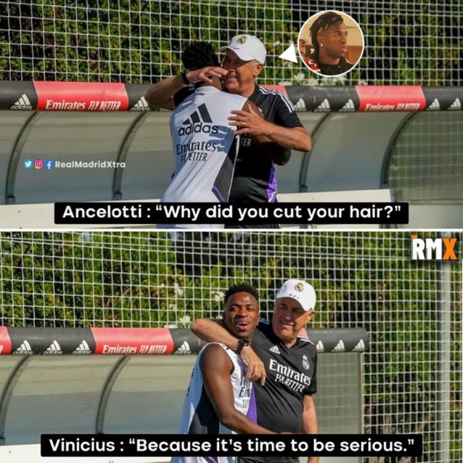 Durante la sesión de entrenamiento del Real Madrid el viernes, el entrenador Carlo Ancelotti fue visto bromeando con Vini, preguntándole juguetonamente por qué decidió cambiar su corte de pelo. Vini respondió que "es hora de ponerse serio".